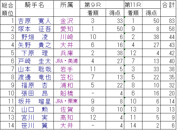 第22回佐々木竹見カップ ジョッキーズグランプリ得点表